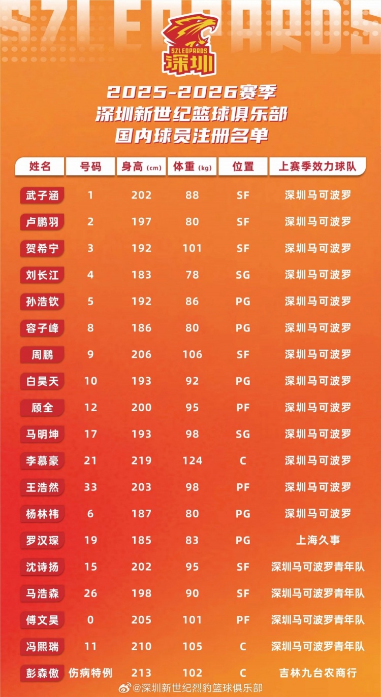 2025-2026赛季深圳新世纪篮球俱乐部国内球员注册名单已正式揭晓。顾全、孙浩钦、武子涵、刘长江成功完成续约;罗汉琛、...