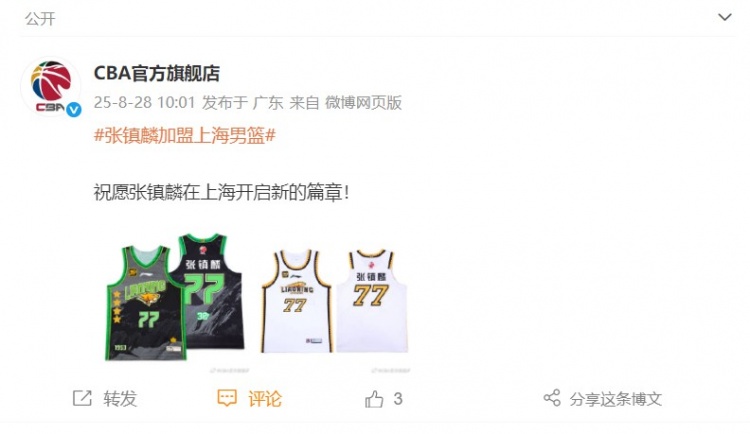 甩卖球衣?CBA官方旗舰店晒张镇麟辽篮球衣 祝球员在沪开启新篇章