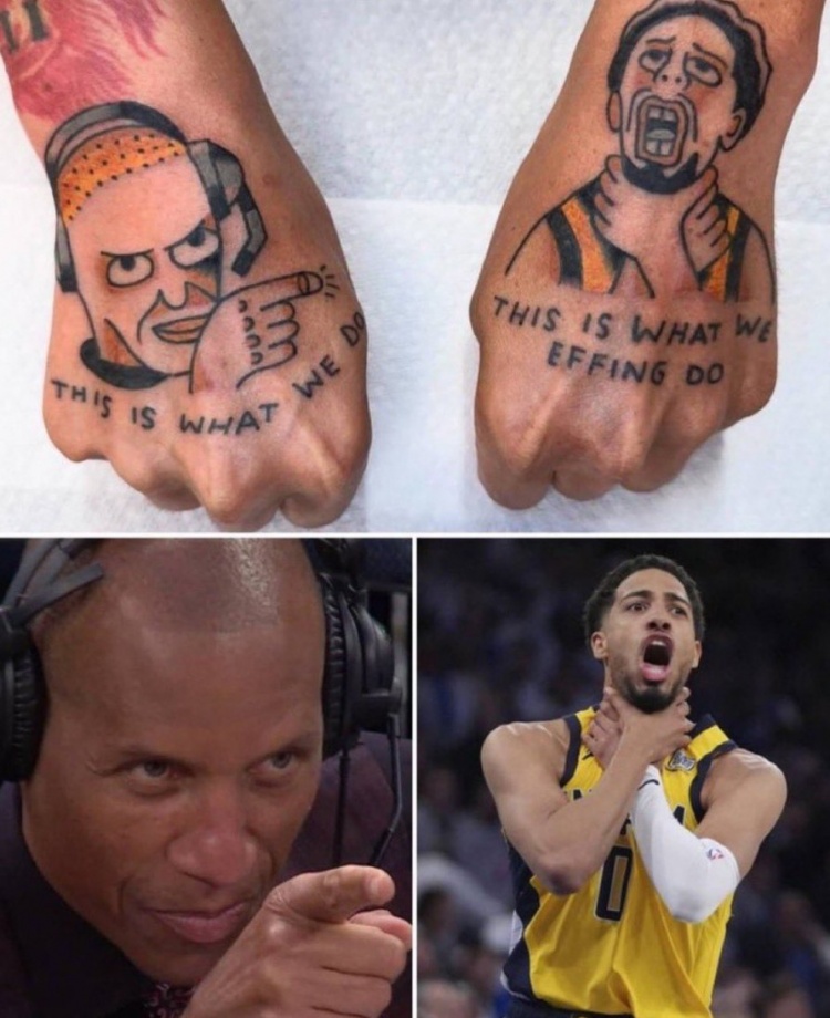 创意!球迷将哈利伯顿“锁喉”庆祝和雷吉-米勒回应照文在手背上