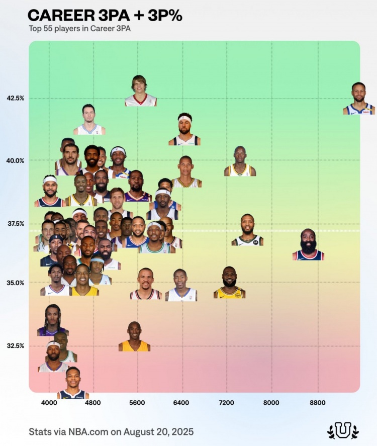8月21日讯 近日,数据媒体NBA University晒出一张NBA历史上三分出手次数排名前55名的球员生涯三分命中率...