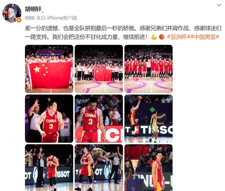 8月18日讯 男篮亚洲杯决赛,中国男篮89-90惜败澳大利亚,获得亚军。中国男篮球员胡明轩发文写道:“差一分的遗憾,也是...