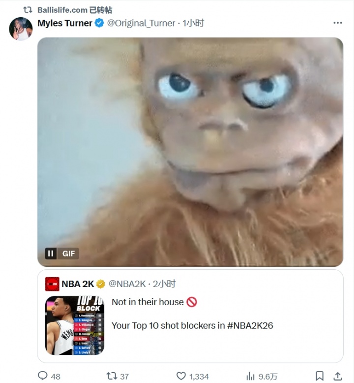 没我?特纳转发2K26盖帽能力前10表情耐人寻味 他上赛季盖帽榜第3