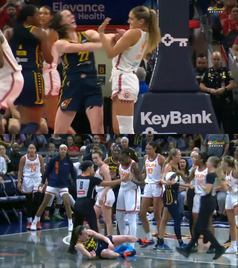 06月18日讯 WNBA常规赛,印第安纳狂热主场迎战康涅狄格太阳。比赛第三节中段,狂热球星克拉克进攻持球背打,被防守球员...