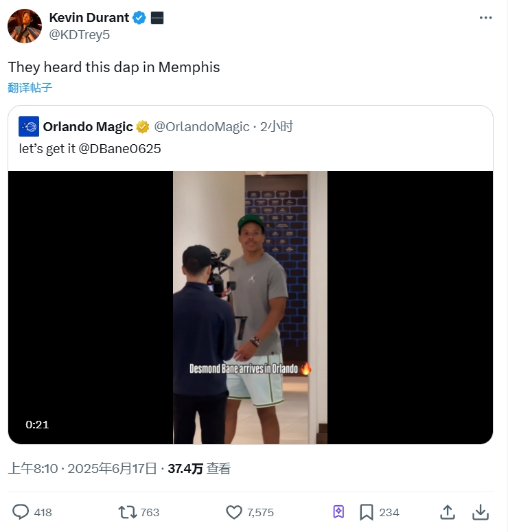 贝恩初访奥兰多,和魔术主帅莫斯利激动击掌,杜兰特转发留下神评论:这击掌声大得孟菲斯的人都能听到了。...