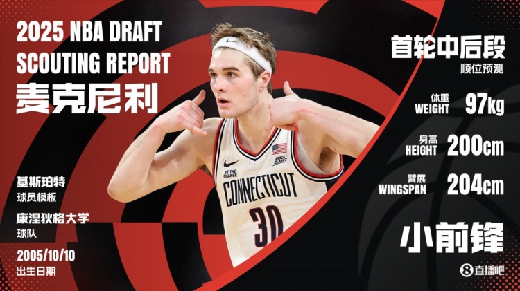 姓名:利亚姆-麦克尼利(Liam McNeeley)出生日期:2005年10月10日位置:小前锋大学:康涅狄格大学身高:...
