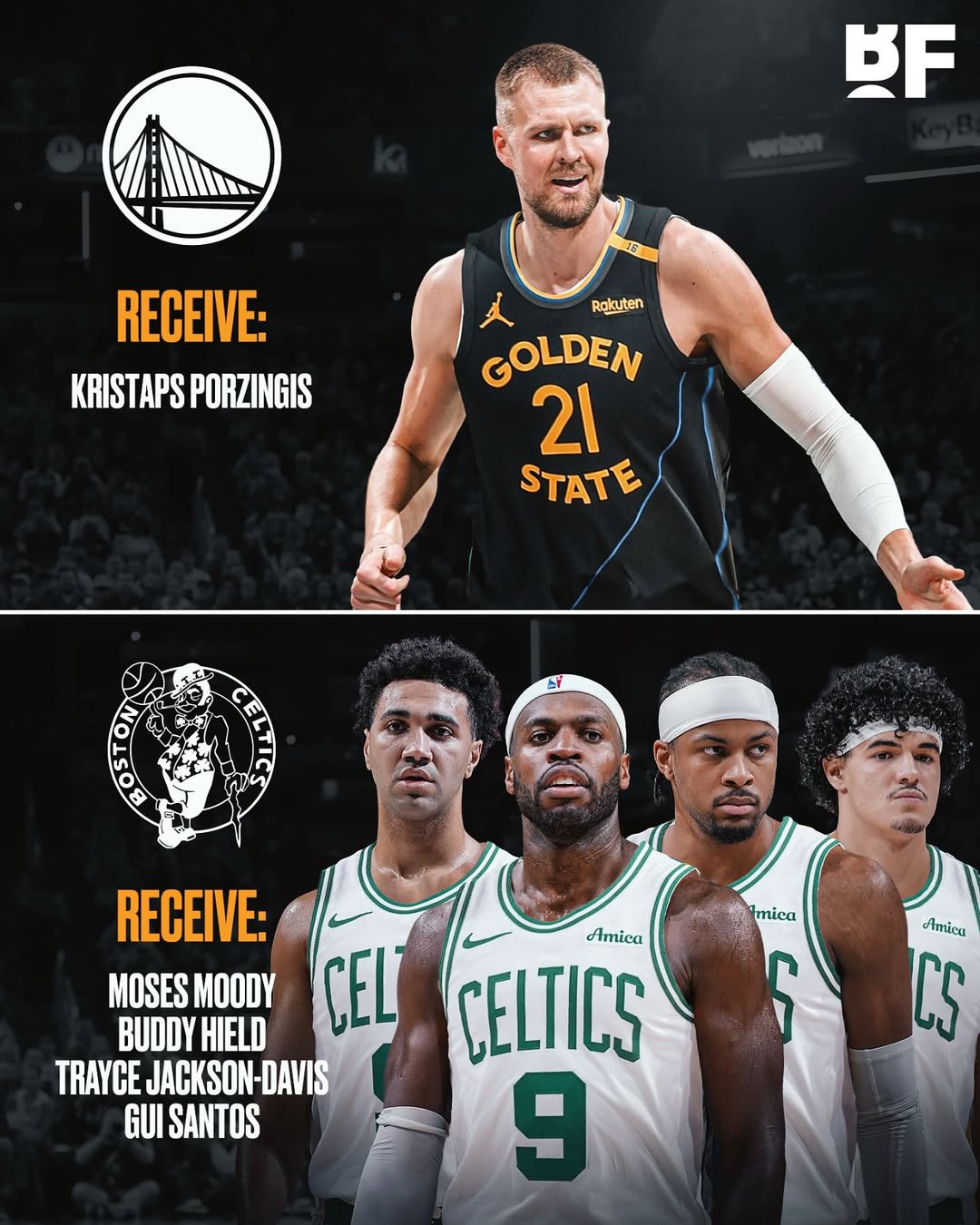 露天看台给出的交易方案:勇士得到:波尔津吉斯;凯尔特人得到:穆迪、希尔德、特雷斯-杰克逊-戴维斯(TJD)、桑托斯。相关...