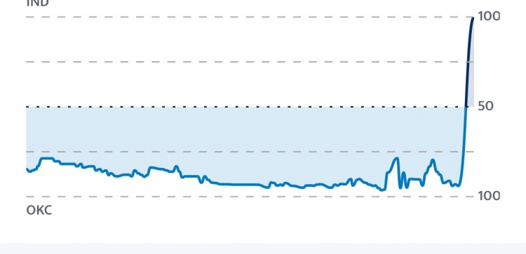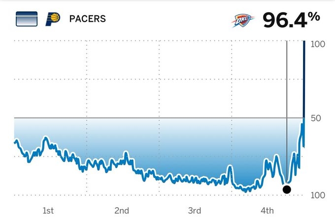 总决赛G1取胜概率曲线:步行者全场不占优 最后时刻两极翻转