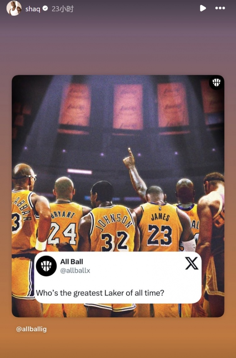 6月2日讯 昨天,湖人名宿沙奎尔-奥尼尔在INS转发一则提问:“谁是湖人有史以来最伟大的球员?”图中从左到右依次是:贾巴...