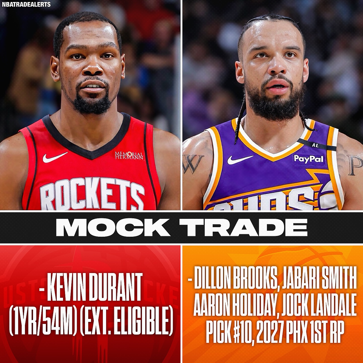 火箭送出狄龙+小贾+霍勒迪+兰代尔+今年10号签+27年首轮得到杜兰特3年7000万重签范乔丹 3年4000万重签亚当斯...