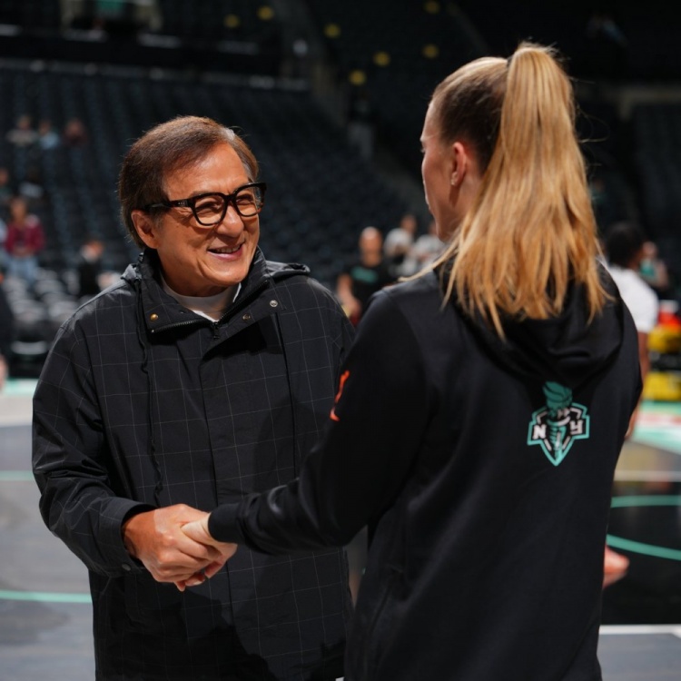 5月30日讯 今日WNBA常规赛纽约自由人对阵金州女武神。WNBA官方赛前晒出中国影星成龙与纽约自由人核心约内斯库的合照...