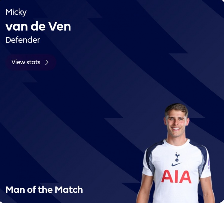 3次拦截+传球成功率95.6%!范德文当选热刺vs狼队最佳球员