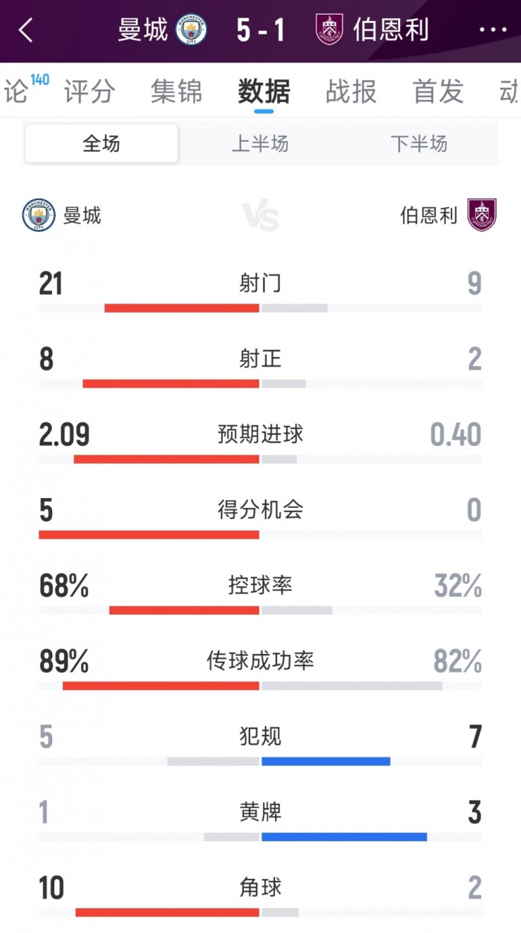 曼城5-1伯恩利全场数据:射门21-9,射正8-2,得分机会5-0