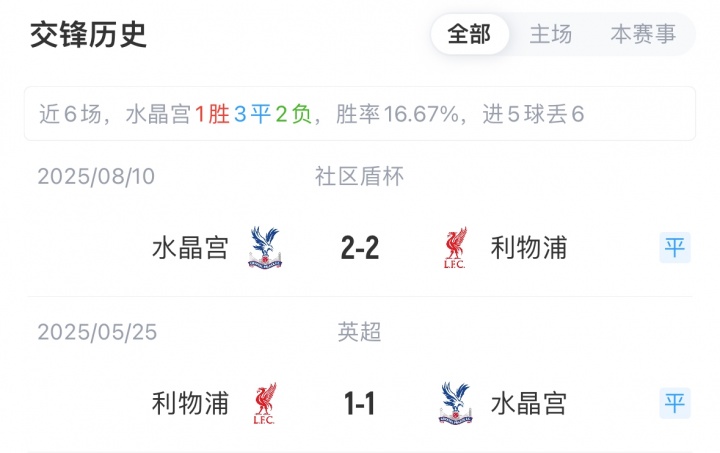 杠上了!水晶宫对利物浦近3场2胜1平保持不败 社区盾点球大战夺冠