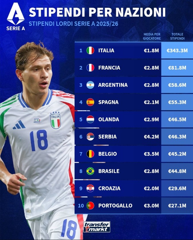 意甲球员薪资盘点:意大利球员总薪资最高,塞尔维亚平均年薪最高