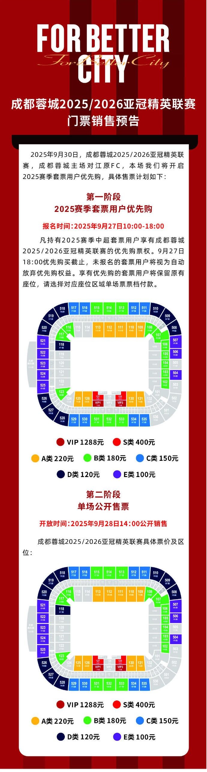 2025/2026亚冠精英联赛第2轮,成都蓉城vs江原FC主场比赛球票优先购、单场公开售票将于近期陆续开启,线上购票相关...