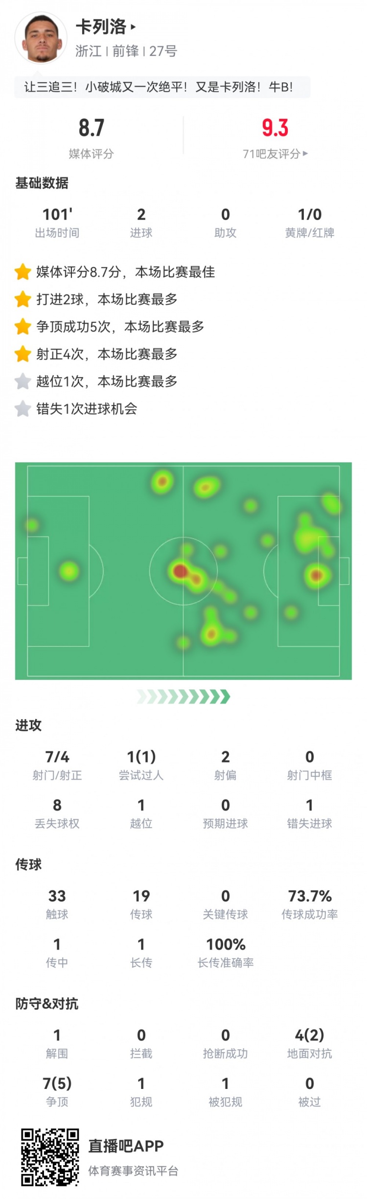 上下半场均读秒破门!卡列洛数据:7射4正2进球,8.7分全场最高
