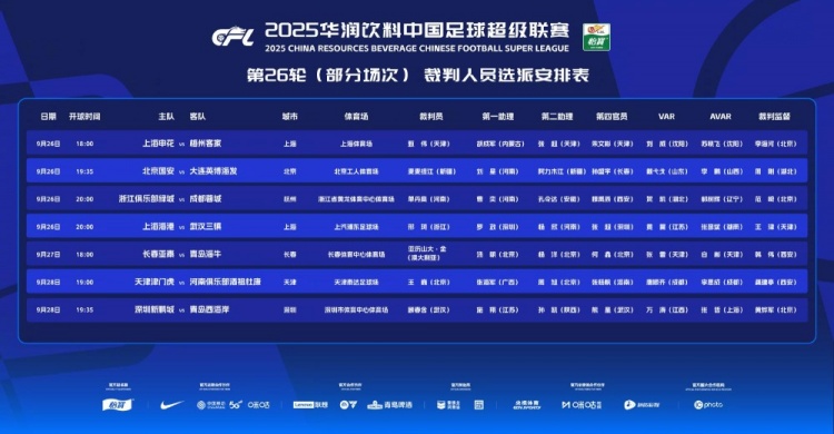 中超第26轮裁判:麦麦提江执法国安vs英博,外籍裁判执法保级大战