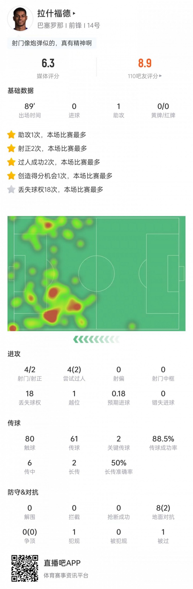 送出助攻!拉什福德数据:2次关键传球+18次丢球权,获评6.3分