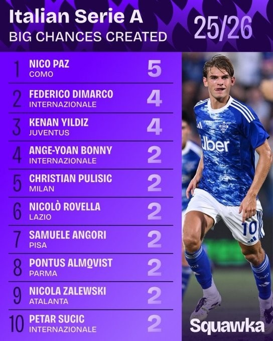9月26日讯 知名足球数据网站Squawka统计了2025/26赛季意甲联赛截至目前的球员创造重大机会榜。来自科莫的尼科...