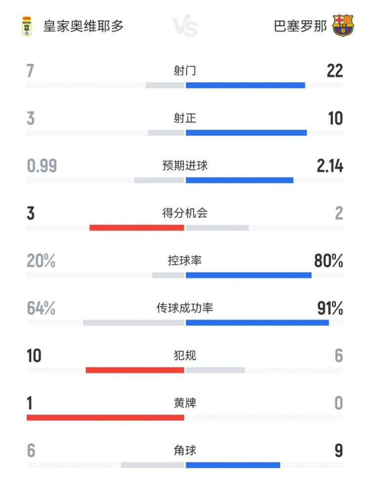 巴萨3-1奥维耶多数据:射门22-7,射正10-3,得分机会2-3