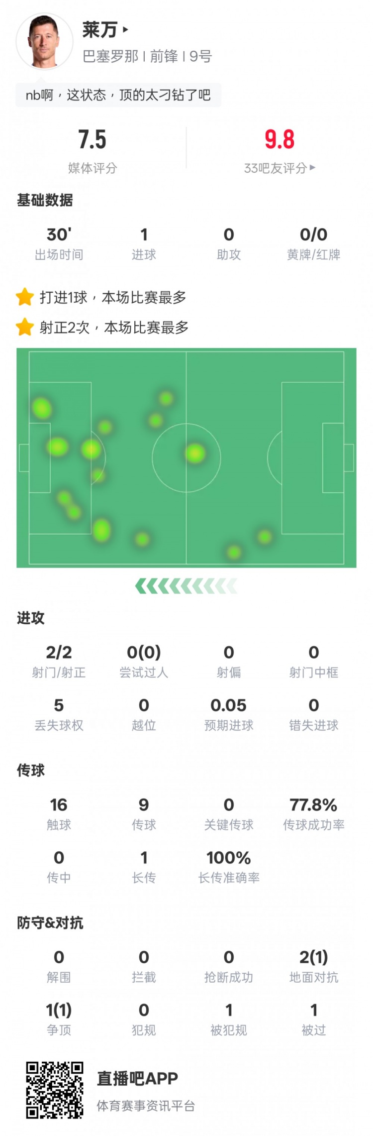 莱万本场数据:替补登场2射门2射正进1球+1争顶成功,评分7.5
