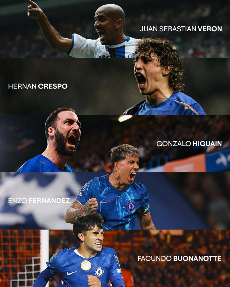 切尔西社媒祝贺博纳诺特:恭喜成为第5位为蓝军进球的阿根廷球员