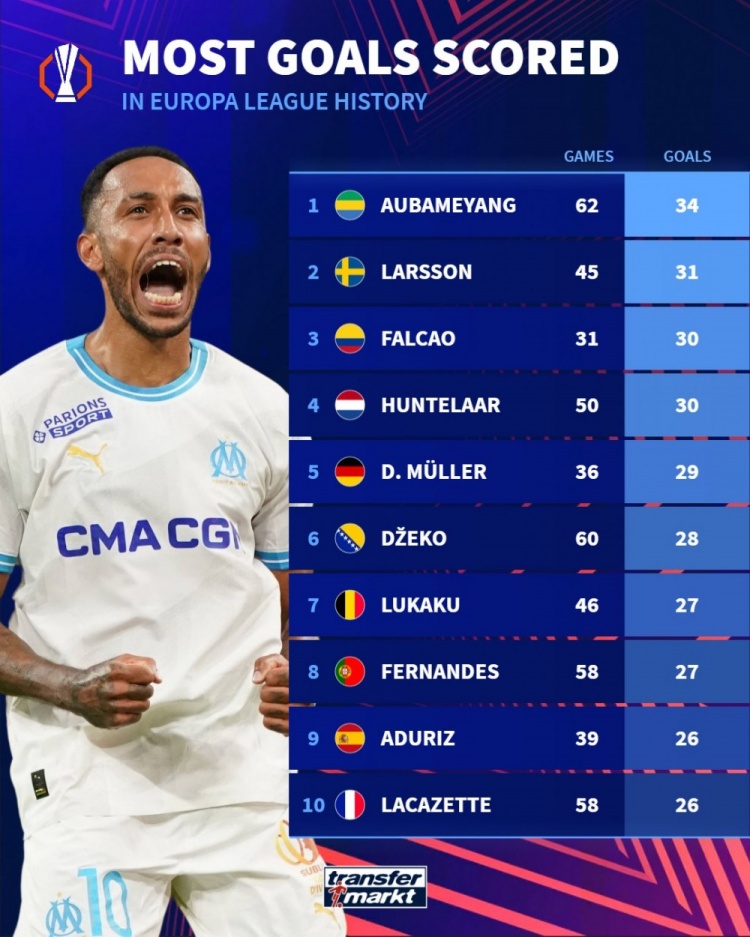 欧联杯历史射手榜:奥巴梅扬34球第一,法尔考31场30球效率恐怖