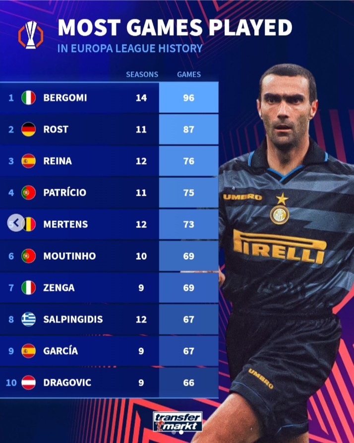 9月25日讯 德转统计了欧联(含前身欧洲联盟杯)球员出场数据,贝尔戈米96场成为出场王,雷纳、曾加位居前十。附欧联球员出...