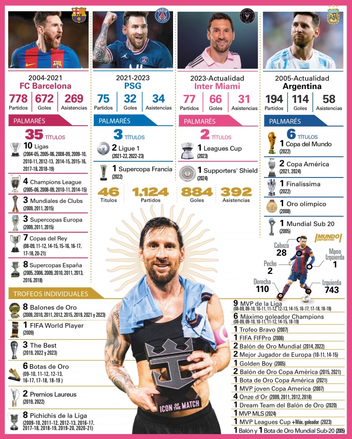 最新版!世体一图看梅西生涯:884球392助,在迈阿密77场66球31助