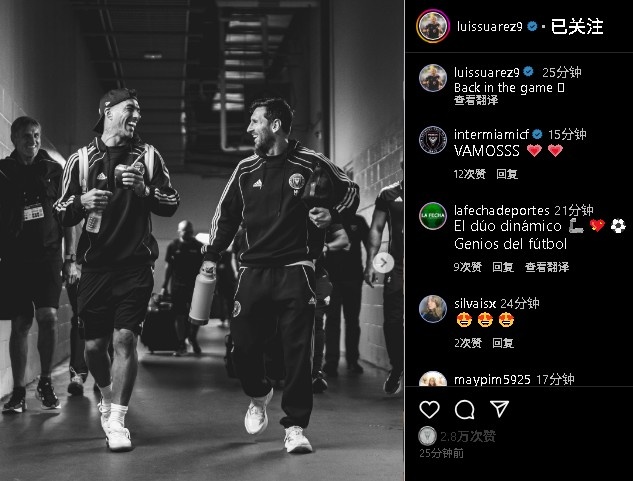 9月25日讯 美职联迈阿密国际4-0战胜纽约城,梅西让出点球,苏亚雷斯点射破门。赛后,本场解禁复出的苏亚雷斯晒出自己和梅...