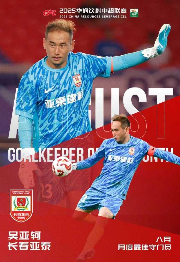 扑救成功率高达82%,亚泰门将吴亚轲当选中超8月最佳守门员