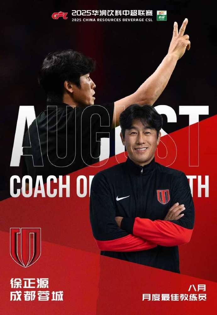 率领蓉城3胜1平!官方:徐正源当选中超8月最佳教练