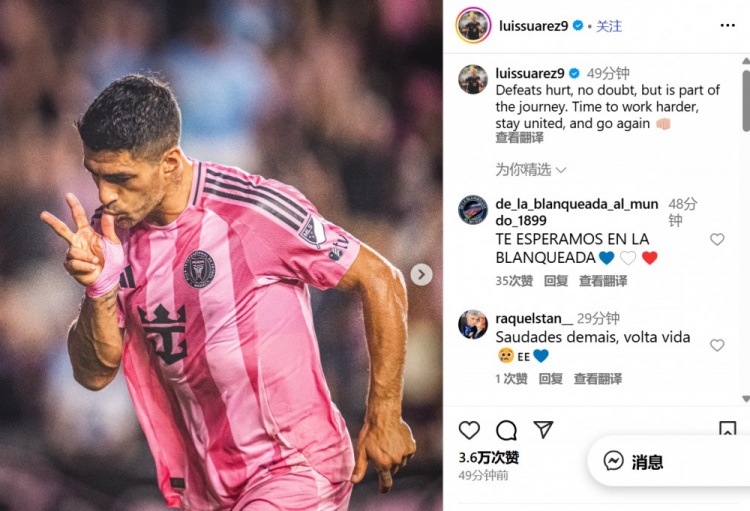 10月1日讯 美职联常规赛,迈阿密国际3-5芝加哥火焰,将争冠主动权交到了费城联合手中,苏亚雷斯在赛后更新了社交媒体。苏...