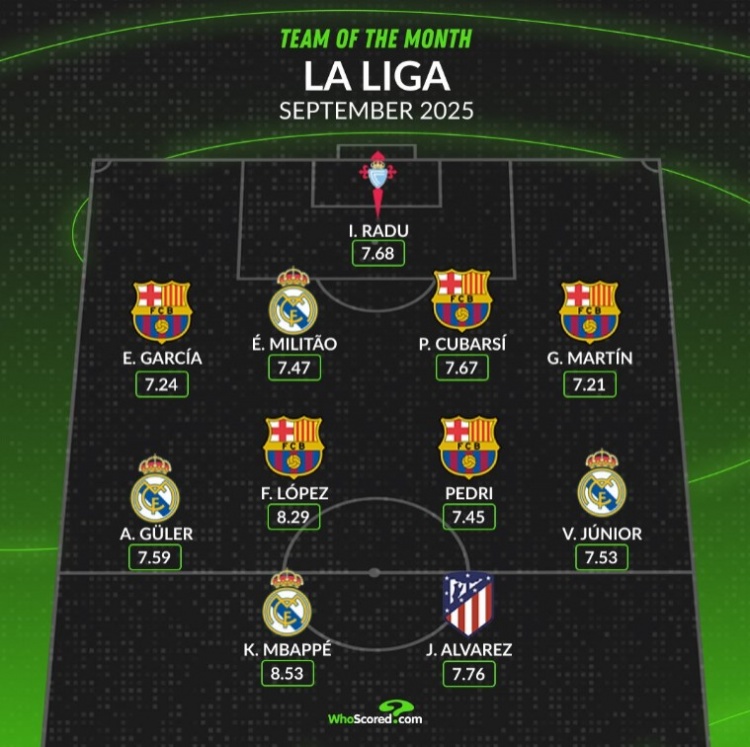 WhoScored西甲9月最佳阵:阿尔瓦雷斯搭档姆巴佩,巴萨5人皇马4人