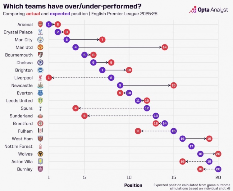 10月2日讯 根据OPTA统计,曼联是本赛季英超实际排名与预期排名(基于射门预期进球值通过模拟算法得出)相差最大的球队。...
