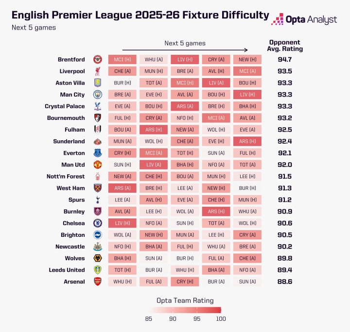👀Opta解析英超未来5轮难度:阿森纳最轻松,利物浦难度第二高
