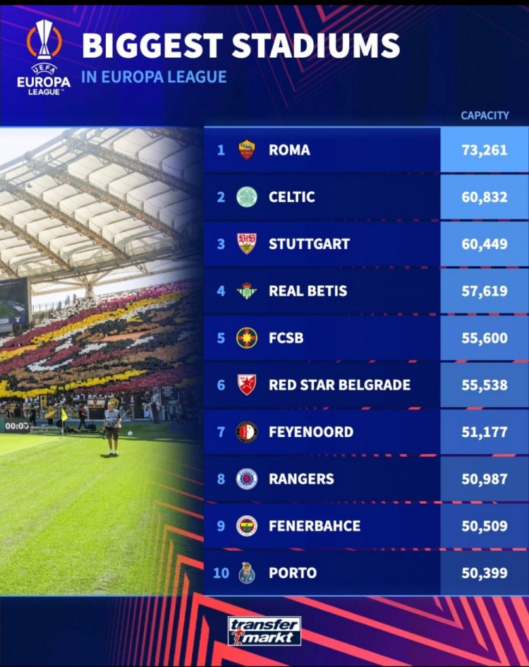 本赛季欧联杯球队主场最大容量榜单:罗马居首,凯尔特人次席