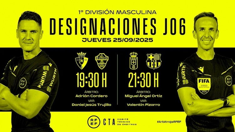 西甲第6轮裁判安排:奥蒂兹执法巴萨,科尔德罗主裁奥萨苏纳