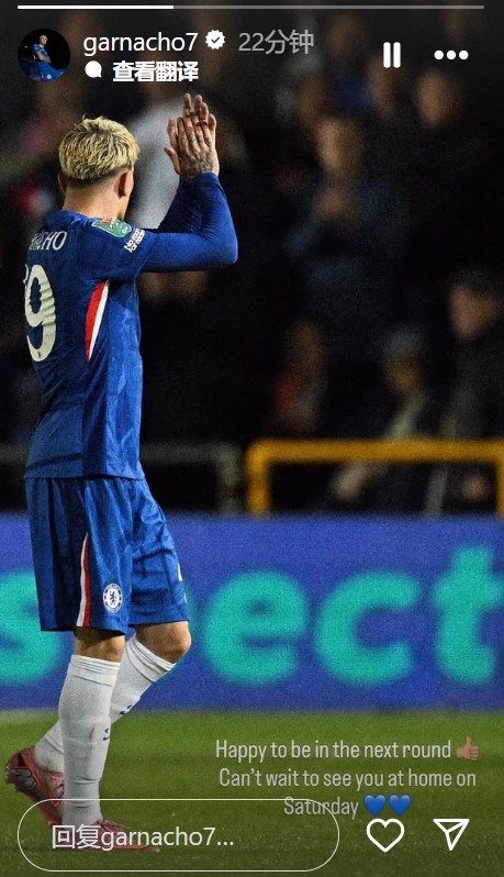 加纳乔社媒:很高兴晋级下一轮,迫不及待想在周六主场见到你们