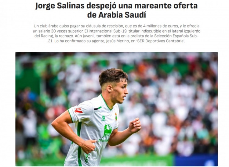 9月24日讯 阿斯报消息,18岁的西班牙U19国脚乔治-萨利纳斯最近成为焦点,他拒绝了来自沙特一家俱乐部的诱人报价。这家...