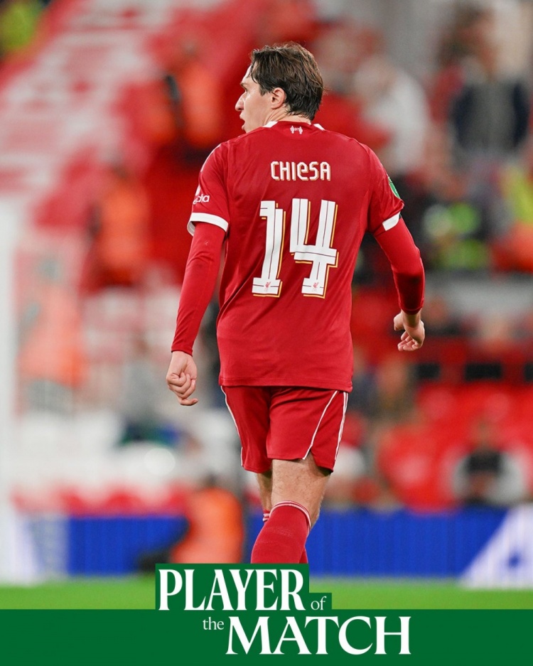助攻双响!基耶萨当选联赛杯第三轮利物浦队内最佳球员