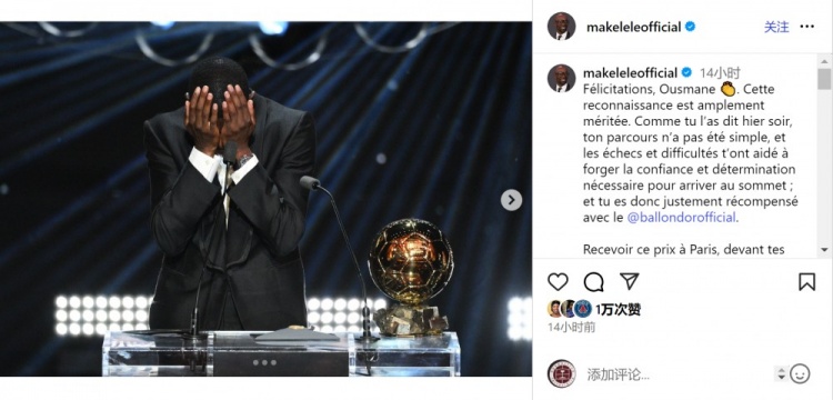 马克莱莱社媒:祝贺登贝莱,挫折与挑战铸就了你登上顶峰的决心