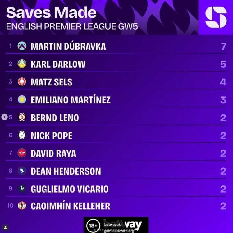 9月24日讯 英超第5轮战罢,squawkafootball列各项数据排行,伯恩利门将杜布拉夫卡是本轮扑救次数最多的门将...