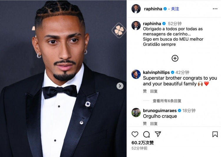 9月24日讯 本周二晚,巴萨边锋拉菲尼亚在个人INS上发文,谈到了自己在金球奖颁奖典礼后的状况。拉菲尼亚写道:谢谢大家所...