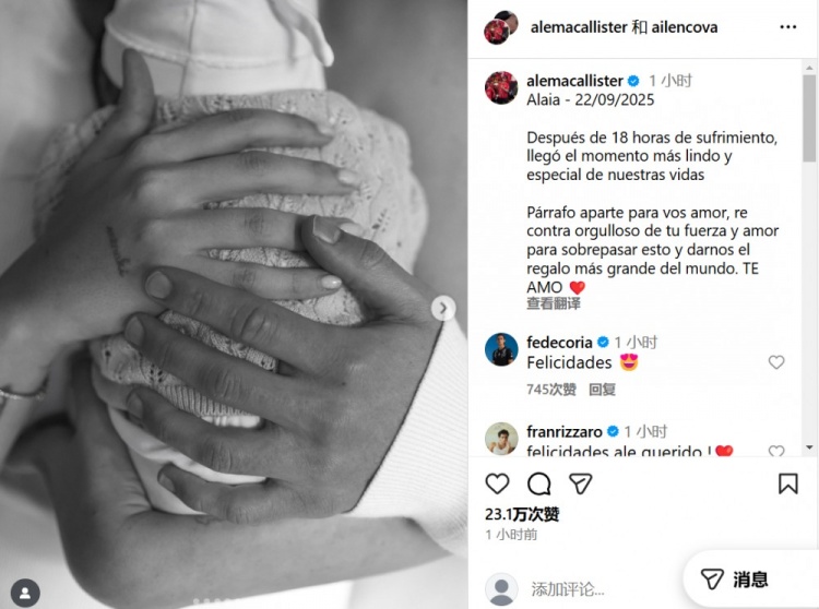 9月24日讯 在社交媒体上,利物浦中场麦卡利斯特宣布自己和女友Ailen Cova的孩子降生。麦卡利斯特写道:经过18小...
