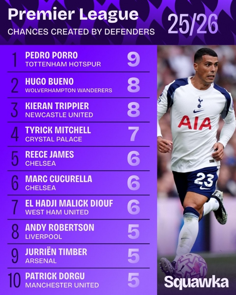 英超后卫创造机会排行:波罗9次居首 布埃诺、特里皮尔8次