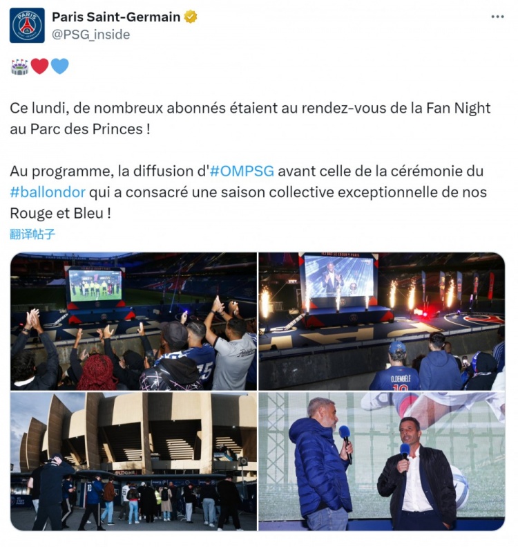 见证荣耀时刻!巴黎球迷在王子公园球场观看金球奖颁奖典礼