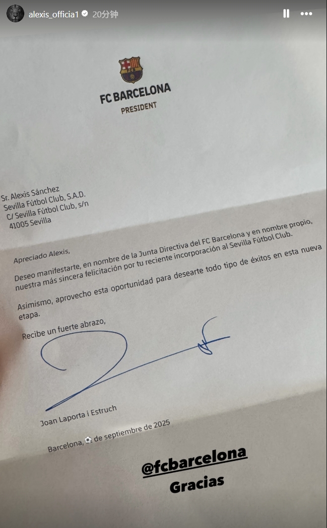 09月23日讯 36岁的智利前锋、巴萨旧将桑切斯今夏回归西甲加盟塞维利亚。今天他更新社媒,展示了一封老东家巴萨发来的贺信...