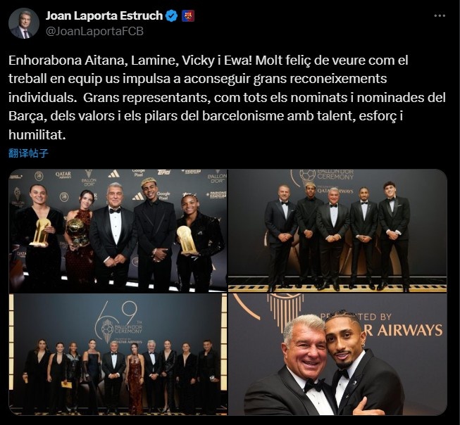 9月23日讯 巴萨主席拉波尔塔更新社媒,祝贺在金球奖颁奖典礼上获奖以及提名的巴萨球员。2025年金球奖颁奖典礼在巴黎进行...