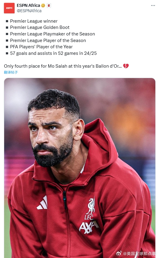 ESPN声援萨拉赫:英超冠军+金靴+助攻王 52场参与57球 金球才第4